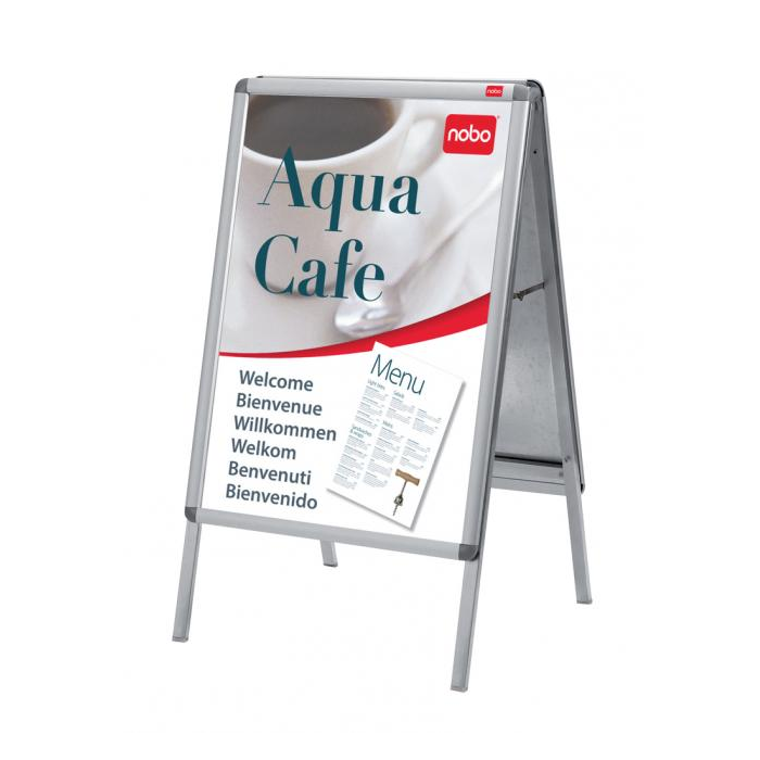 Rám na zobrazovanie informácií, plagátov alebo propagačných ponúk do interiéru aj exteriéru. Mechanizmus otvárania na klip, antireflexná fólia z PVC na ochranu pred špinou a prachom, vkusný hliníkový rám s tmavosivými rohovými spojkami. Verzia „A“ so stojanom. Formát A1. Rozmery v × š × h : 1 095 × 605 × 651 mm.