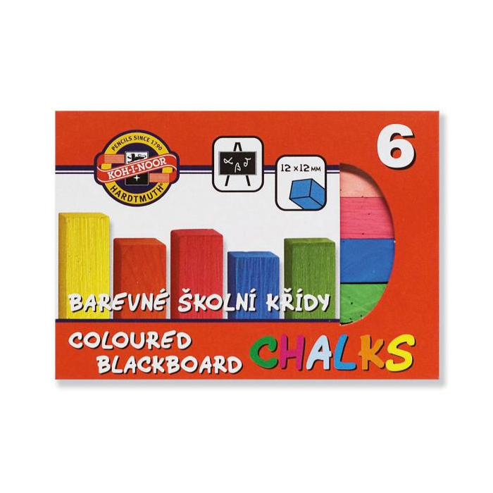 Farebné kriedy na školské tabule. Rozmery 12 x 12 x 100 mm. Dodávané v sade 6 farieb (žltá, oranžová, karmínová, tmavomodrá, tmavozelená, hnedá). Väčšie balenie 40 sád.