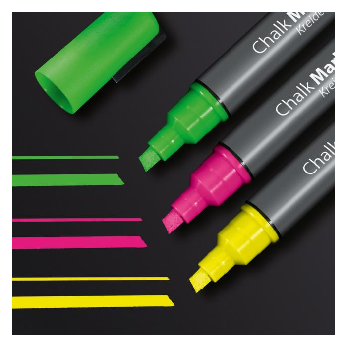 Ľahko stierateľné a vysoko nepriehľadné kriedové popisovače vhodné na sklenené tabule a všetky hladké povrchy podobné sklu. Zrezaný hrot hrúbky 1 - 5 mm. Vodeodolný atrament je zmazateľný vlhkou alebo suchou utierkou. Farba mix, žltá, ružová, zelená.