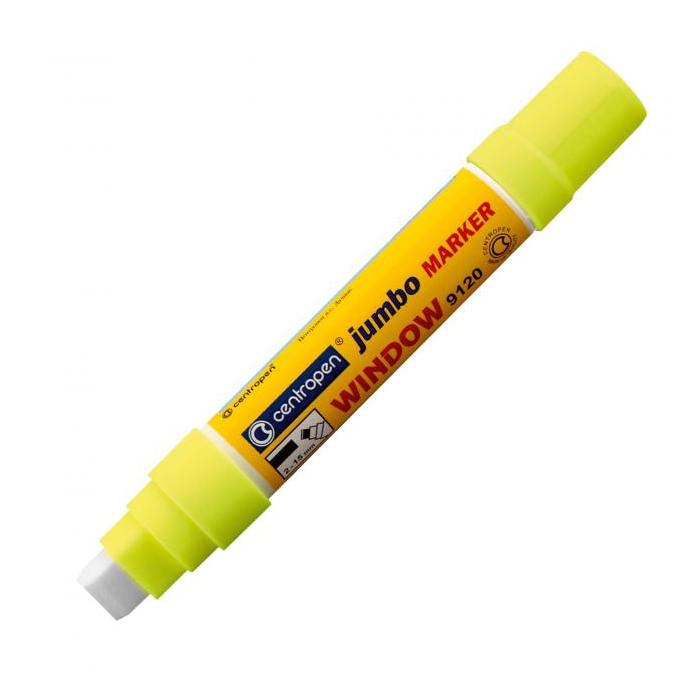 Špeciálny popisovač na okná, zrkadlá, výklady. Tekutá krieda na vodnej báze so silnými krycími schopnosťami, stierateľná. Zrezaný hrot, šírka stopy 2 - 15 mm. Väčšie balenie 5 ks v jednej farbe. Farba žltá.