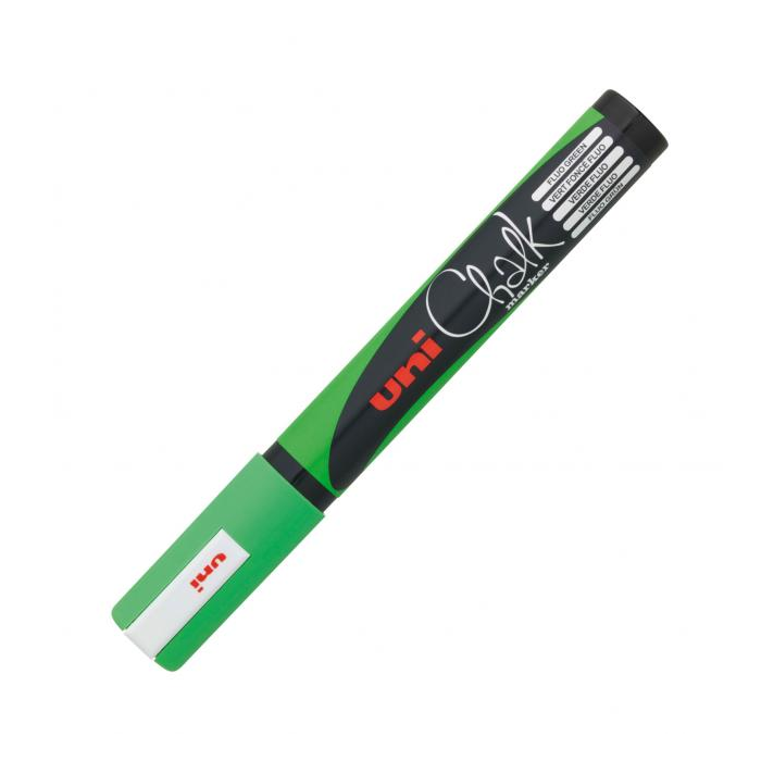 Kriedové popisovače s možnosťou použitia pre priemysel, dekoráciu, informačné tabule a hobby. Na čistých a odmastených neporéznych povrchoch text po zaschnutí odoláva vode a UV, ale je stierateľný vlhkou handričkou. Vhodné na okná, zrkadlá, kovové a plastové povrchy. Hrot guľatý, šírka stopy 1,8 - 2,5 mm. Farba neónovozelená.