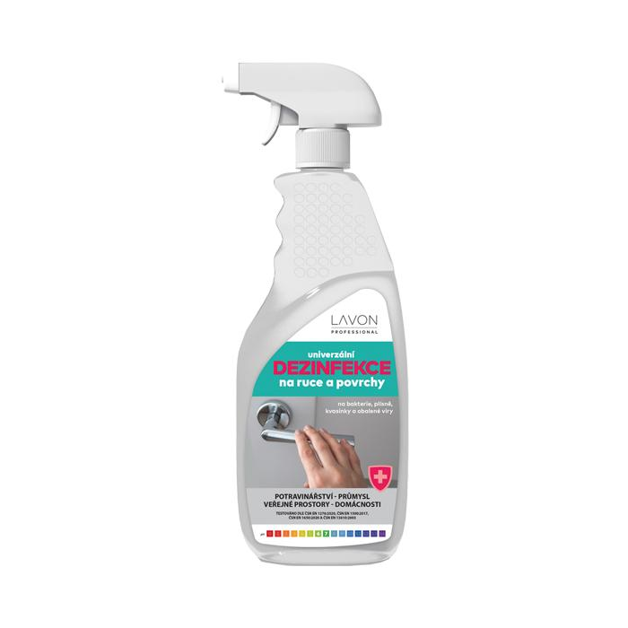 LAVON univerzálny dezinfekčný prostriedok na ruky a povrchy je biocídny výrobok na spotrebiteľské a profesionálne použitie v potravinárstve, priemysle, domácnostiach a verejných priestoroch. Je určený na dezinfekciu rúk, pracovných plôch alebo povrchov zariadení. Ako preventívne opatrenie používajte na miestach, ktoré prichádzajú často do kontaktu s rukami (držadlá, zábradlia, kohútiky atď.). Testované podľa noriem EN 1276:2020, EN 1500:2017, EN 1650:2020 a EN 13610:2003. Obsahuje 65 % alkoholu.