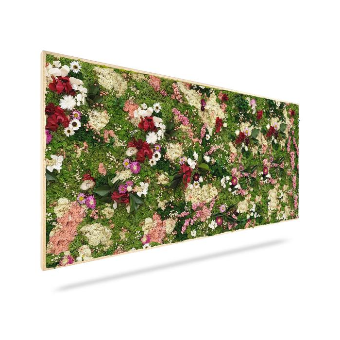 Machový obraz RASTLINY Huelma je tvorený podkladom z lišajníkového machu v prírodných odtieňoch so stabilizovanými kvetmi ružových a bledo béžových až bielych farieb.