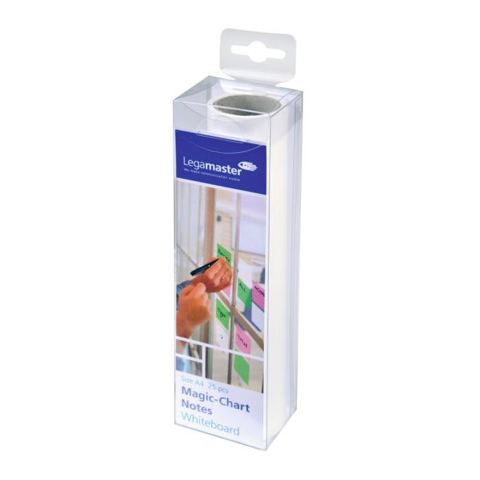 Bloky a rolka popisovateľné popisovačmi na biele tabule, zmazateľné prstom, vreckovkou alebo handričkou a opätovne použiteľné pre ďalšie poznámky. Priľnú na rôzne povrchy - sklo, stenu, drevo, tapetu, chladničku bez použitia lepidla. Jednoducho ich zľahka pritlačíte na daný povrch. Súčasťou balenia je 1 popisovač. Farba biela. Rolka 25 ks.