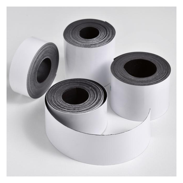 Magnetická páska na označovanie predmetov. Na jednej strane magnetická, na druhej strane popisovateľná. Vhodná na popisovanie tabuľovými popisovačmi alebo permanentnými popisovačmi. Dá sa strihať. Magnetická sila cca. 32 g/cm². Hrúbka: 0,6 mm. Farba biela.
