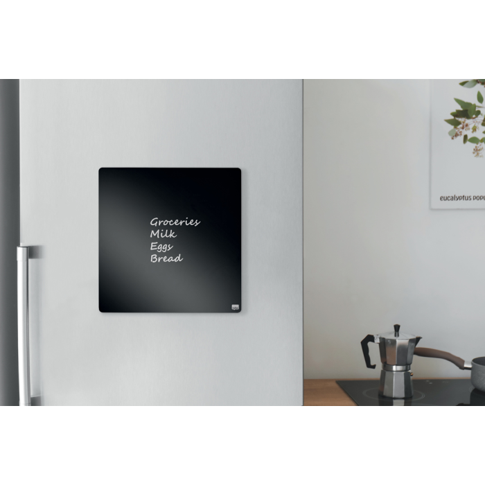 Kompaktné magnetické dielce stierateľné za sucha majú ideálnu veľkosť pre každý pracovný stôl, doma i v kancelárii. Obsahujú dva magnety, biely popisovač s mazacou hubou a montážnu penovú pásku. Farba: čierna. Rozmery 360 × 360 mm.