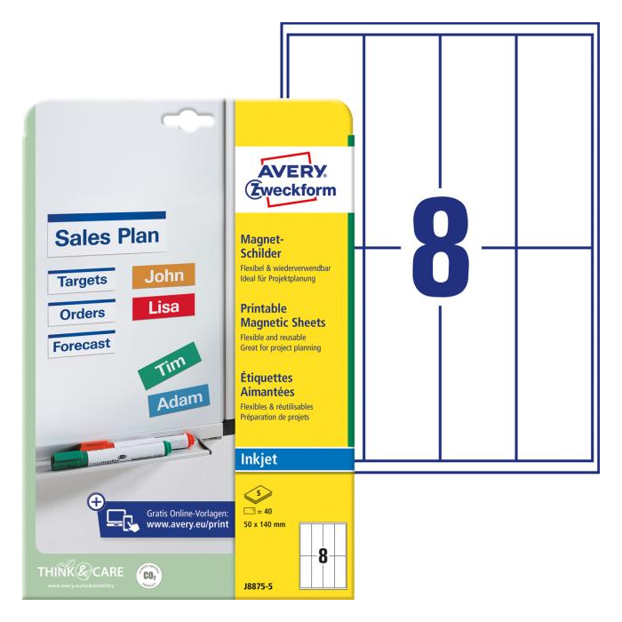 Vytvorte si magnety sami, pomocou vlastného počítača a tlačiarne. Na kovové regály, biele alebo magnetické tabule. Môžete ich ľubovoľne premiestňovať a opätovne používať. Flexiblné a jednoduché označovanie. Mikroperforované. V balení je 5 harkov. Na hárku 8 etikiet.
