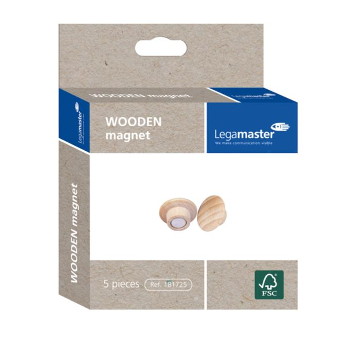 Guľaté magnety z buka lesného, pochádzajúceho z trvalo udržateľných lesov. Vynikajúci doplnok pre biele a sklenené tabule. Každý z magnetov je jedinečný svojou farbou a vzhľadom. V balení 5 ks. Priemer 25 mm.