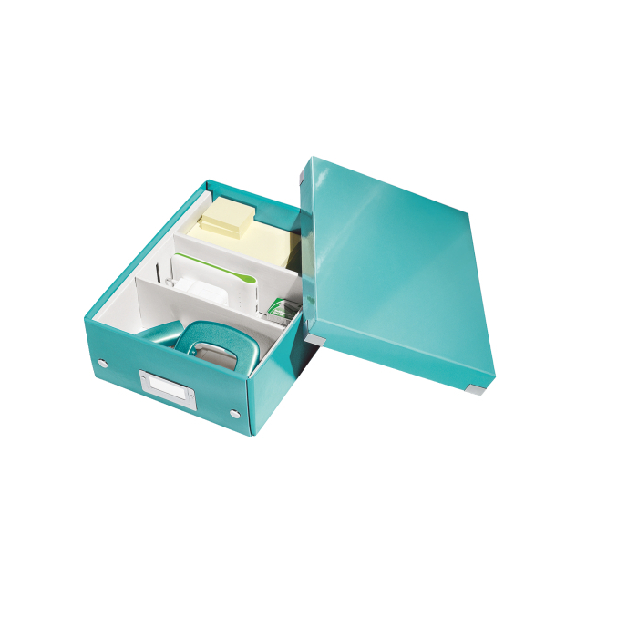 Malá štýlová skladacia krabica s vekom a s rámčekom na štítok. Na usporiadanie nabíjačiek, káblov a ďalšieho vybavenia kancelárie. Veľkosť S. Na prvý pohľad vidíte, čo sa vojde dovnútra! Výška krabice bola navrhnutá tak, aby vám poskytla dostatok priestoru na uloženie príslušenstva a zároveň zabránila skladaniu vecí na seba. Na vylepšenie usporiadania obsahu krabice použite priložený vnútorný systém priehradiek. Môžete rozdeliť krabicu na 2 alebo 3 časti a zabrániť tak miešaniu káblov alebo fotiek. Inteligentná skladacia konštrukcia: rýchle a jednoduché zloženie bez nutnosti použitia skrutiek a možnosť opätovného rozloženia na úsporu miesta, keď krabicu práve nepotrebujete. Moderný vzhľad a farby na skrášlenie vašej kancelárie alebo domova. Lesklé vyhotovenie vytvára prvotriedny vzhľad škatule a umožňuje dlhodobé používanie a jednoduché utieranie prachu. Rámček na štítok pre jednoduché označenie obsahu. Materiál pevný kartón potiahnutý polaminovaným papierom. Farba ľadovo modrá.