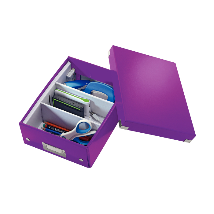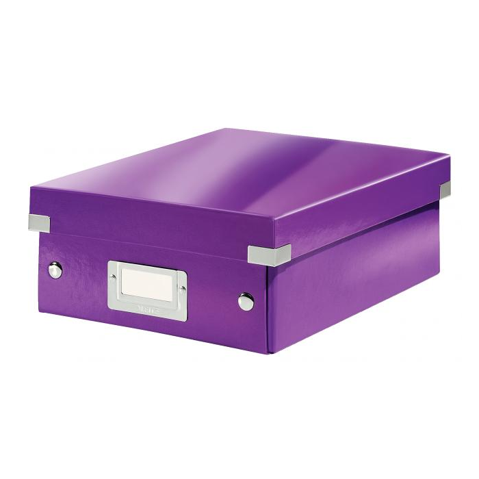 Malá štýlová skladacia krabica s vekom a s rámčekom na štítok. Na usporiadanie nabíjačiek, káblov a ďalšieho vybavenia kancelárie. Veľkosť S. Na prvý pohľad vidíte, čo sa vojde dovnútra! Výška krabice bola navrhnutá tak, aby vám poskytla dostatok priestoru na uloženie príslušenstva a zároveň zabránila skladaniu vecí na seba. Na vylepšenie usporiadania obsahu krabice použite priložený vnútorný systém priehradiek. Môžete rozdeliť krabicu na 2 alebo 3 časti a zabrániť tak miešaniu káblov alebo fotiek. Inteligentná skladacia konštrukcia: rýchle a jednoduché zloženie bez nutnosti použitia skrutiek a možnosť opätovného rozloženia na úsporu miesta, keď krabicu práve nepotrebujete. Moderný vzhľad a farby na skrášlenie vašej kancelárie alebo domova. Lesklé vyhotovenie vytvára prvotriedny vzhľad krabice a umožňuje dlhodobé používanie a jednoduché utieranie prachu. Rámček na štítok pre jednoduché označenie obsahu. Materiál pevný kartón potiahnutý polaminovaným papierom. Farba purpurová.