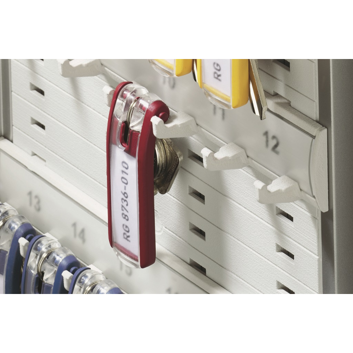 Inovované menovky na kľúče z vysokokvalitného plastu vnášajú do skriniek poriadok a systém a rušia chaos pri doterajšom skladovaní kľúčov. Kľúče visia pod menovkou, a tým je text na menovke zo všetkých strán viditeľný. Výrobu štítkov na menovky je možné voľne stiahnuť z internetovej adresy www.durable.de. Balenie 6 ks. Farba: červená