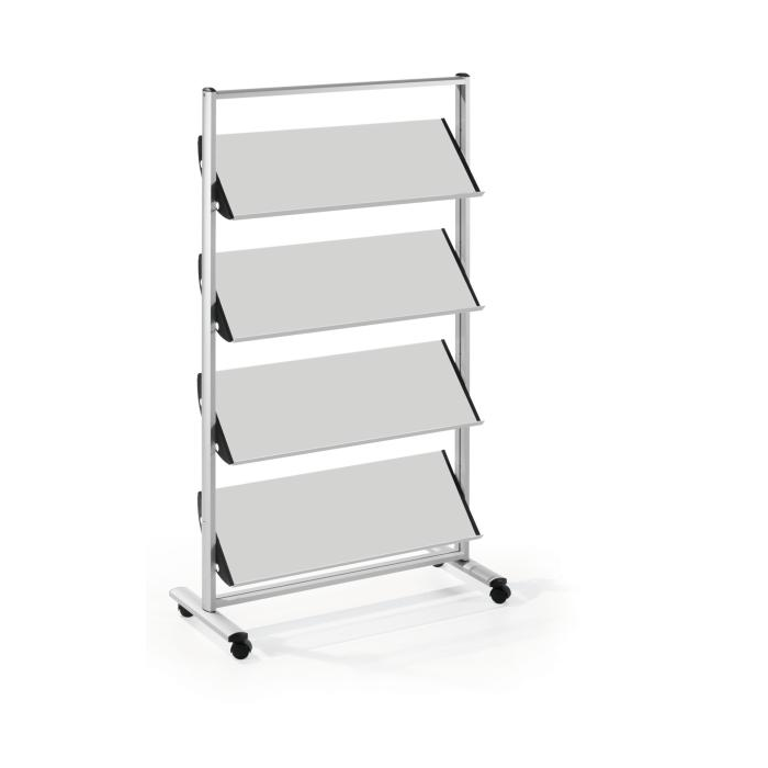 Vysoko kvalitný elegantný a pevný mobilný prezentačný stojan na časopisy alebo katalógy formátu A4. Stojan je dodávaný v rozloženom tvare. Materiál kov. Farba svetlosivá/-čierna. Štyri police s možnosťou fixácie v 3 sklonoch na max. 12×A4 formátov.