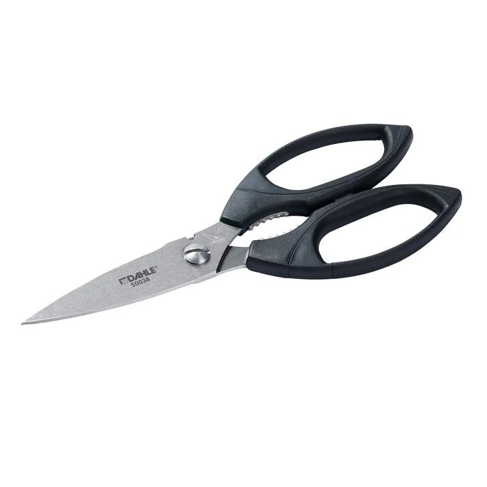Vysokokvalitné profesionálne nožnice s precízne brúsenými čepeľami s mikro zúbkovaním a špeciálne brúseným ostrím, rukoväťou z ABS plastu a strihacou časťou z vysoko kvalitnej nehrdzavejúcej ocele. Určené na rezanie tvrdých a pevných materiálov. Nehrdzavejúce, umývateľné v umývačke riadu a farebne stály materiál pre dlhú životnosť. Každé nožnice sú ručne testované pre zaručenie maximálnej kvality. Praktická pridaná hodnota vďaka otváraču na poháre integrovanému v rukovätiach. Farba čierna. Veľkosť: 21 cm
