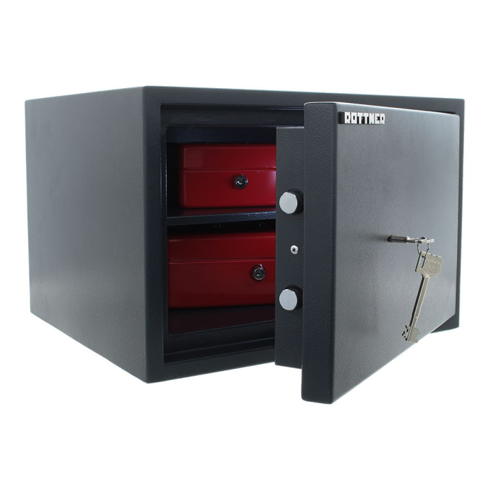 Antracitový dvojplášťový nábytkový trezor ponúka dostatok priestoru pre dôležité doklady, úradné dokumenty alebo cestovné doklady.