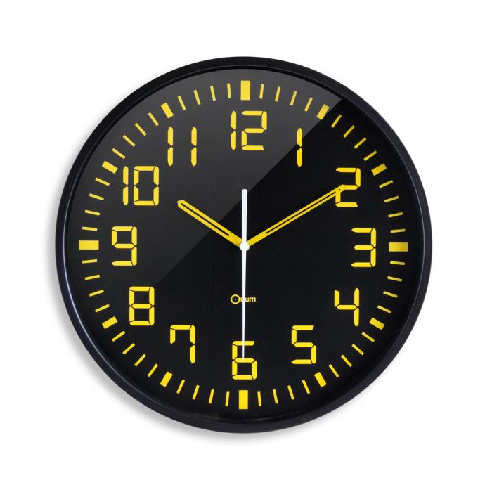 Quartz hodiny s analógovým zobrazením času a tichým chodom. Čierny ciferník kontrastuje s veľkými žltými arabskými číslicami a bielou sekundovou ručičkou. Materiál ABS plast, odolný voči nárazom, ochranné minerálne sklo, priemer 30 cm. Batéria AA je súčasťou balenia.