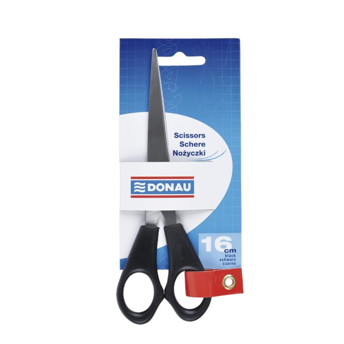 Kancelárske nožnice na strihanie papiera, kartónu, lepenky, samolepiacej pásky a pod. s pogumovaným úchytom a strihacou časťou z nehrdzavejúcej ocele. Farba čierna.