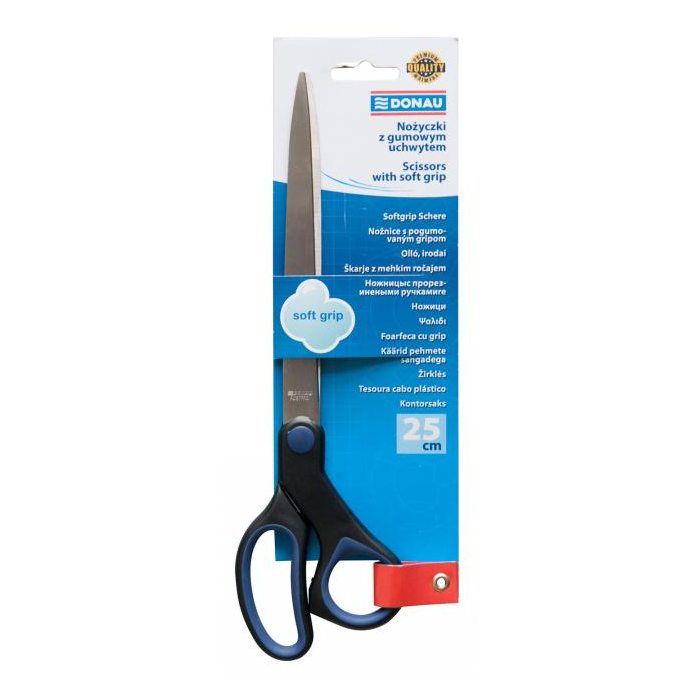Kancelárske nožnice na strihanie papiera, kartónu, lepenky, samolepiacej pásky a pod. s pogumovaným úchytom a strihacou časťou z nehrdzavejúcej ocele. Farba čierna/-modrá. Veľkosť: 25 cm