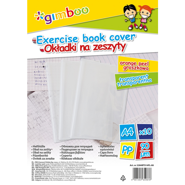 Obaly na zošity formátu A4. Povrch zrnitý, hrúbka 90 µm. Balenie 10 ks, každý kus s ean kódom.