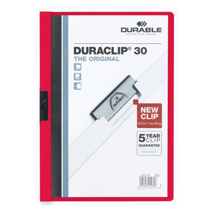Obal vyvinutý spoločnosťou DURABLE pre viazanie nedierovaných listov. Materiál z PVC s unikátnym kovovým klipom, ktorý sa prispôsobí vloženému počtu listov a priehľadnou prednou stranou. Ideálny na prezentácie, ponuky, správy, poznámky na konferencie, semináre a pod. Formát A4. Kapacita 1-30 listov. Väčšie balenie 25 ks.