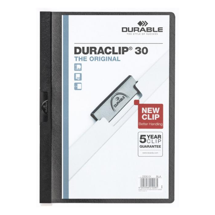 Obal vyvinutý spoločnosťou DURABLE pre viazanie nedierovaných listov. Materiál z PVC s unikátnym kovovým klipom, ktorý sa prispôsobí vloženému počtu listov a priehľadnou prednou stranou. Ideálny na prezentácie, ponuky, správy, poznámky na konferencie, semináre a pod. Formát A4. Kapacita 1-30 listov. Väčšie balenie 25 ks.