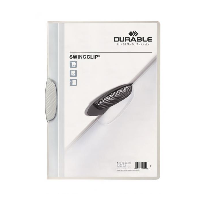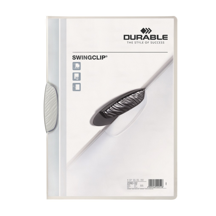 Obal z pevného číreho polypropylénu s nepriehľadným farebným vyklápacím klipom. Formát A4. Kapacita 1-30 listov. Väčšie balenie 25 ks. Farba klipu: biela Farba obalu: číra Kapacita: 1-30 listov