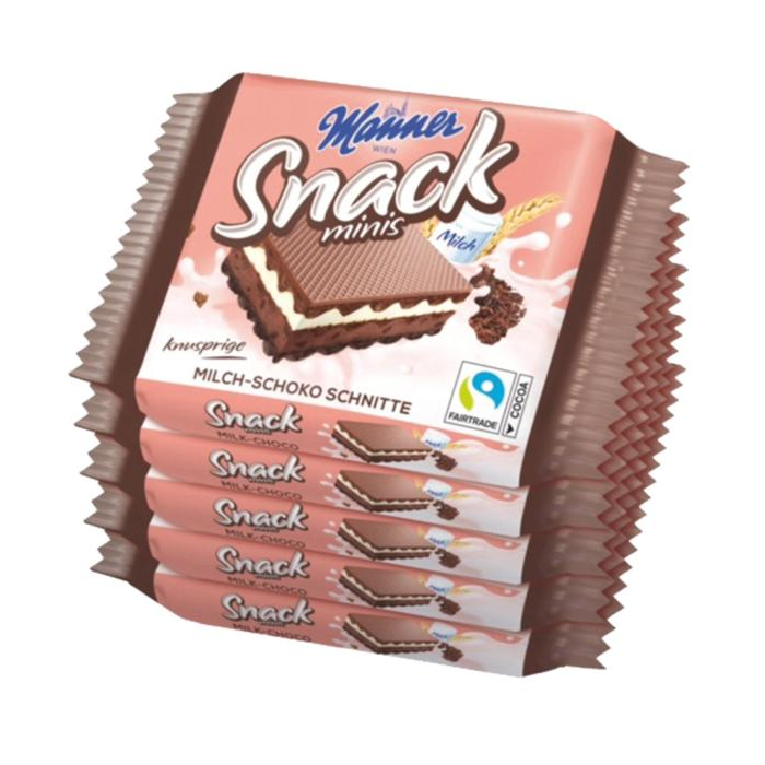 Doprajte si chutný pôžitok bez ohľadu na to, kde ste - cez prestávku v kancelárii, ako skvelé občerstvenie na výlete alebo ako malú odmenu „iba pre vás“ po náročnom dni - Manner Snack Minis sú vždy s vami. Sú také rozmanité ako život sám a dokážu premeniť každú prestávku na chrumkavý okamih plný radosti. Extra chrumkavé a extra mliečne - pretože okrem mliečneho krému si vás celkom získajú jedinečnou kakaovou náplňou s kúskami sušienok medzi 3 vrstvami chrumkavých oplátok. A čo je na nich najlepšie? Pri výrobe Manner Snack Minis v srdci Viedne používame 100 % certifikované FAIRTRADE kakao!