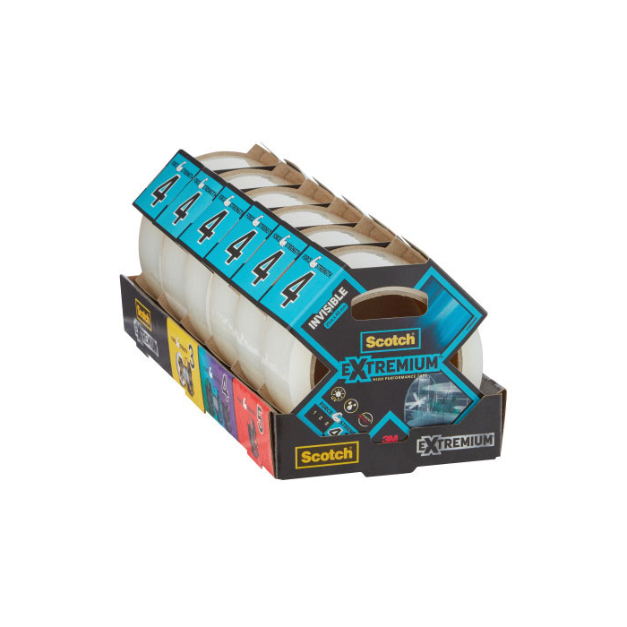 Keď potrebujete vykonať nenápadné opravy, použite neviditeľnú pásku Scotch® Extremium™ Invisible. Má vysokú priľnavosť a je takmer neviditeľná, bez riedkeho plátna, aby bola úplne priehľadná.