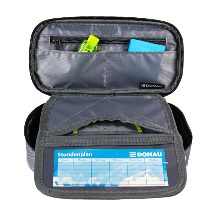Peračník vyrobený z odolného polyesteru so zipsom. Vo vnútri sa nachádza priehradka na zips a dve praktické vrecká. Vnútorná chlopňa ponúka vrecko na štvorec a priehľadné okienko na rozvrh. Desať pútok na perá udrží veci poriadok. Peračník je prázdny.