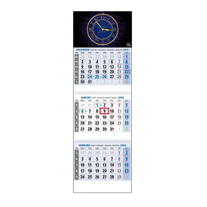 Rozmery: 295 x 925 mm. ROZSAH: 3 x 12 listov. KALENDÁRIUM: 3-mesačné s menami SK, názvy mesiacov a dní v SK. VÄZBA: 1x šitá s perforáciou, 2x špirála. REKLAMNÁ POTLAČ: 2 x 295 x 30 mm, 295 x 60 mm. BALENIE: 20 ks.S hodinami QL.