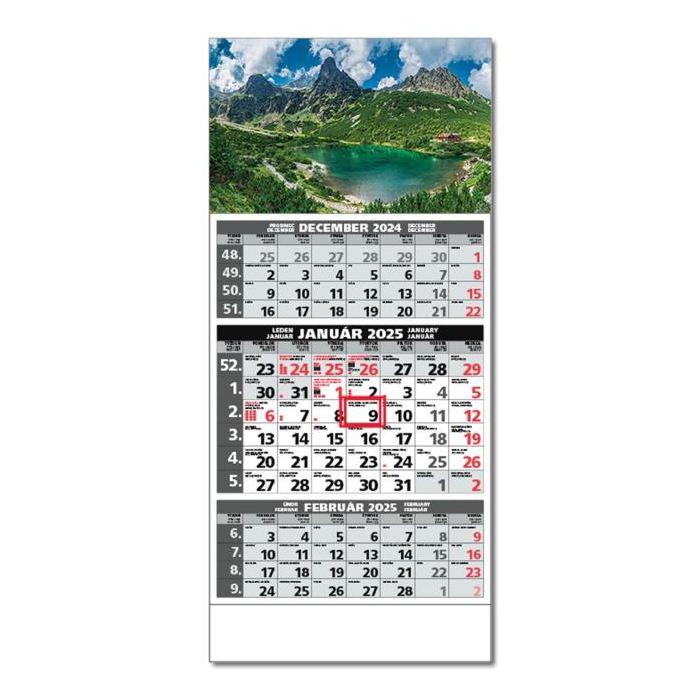Plánovací kalendár s 3-mesačným kalendáriom s menami v SK + CZ, názvy mesiacov a dní v SK, CZ, EN, DE a HU