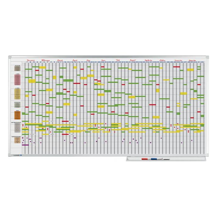 Ročný plánovač série PROFESSIONAL s oddielmi 7dňových týždňov a sieťou 365 dní. Zvlášť výhodné pre plány, ktoré počítajú aj s víkendami. Víkendy vytieňované v sivej farbe. Vhodné pre 75 ľudí/ udalostí. Plánovač obsahuje pásiky s názvami mesiacov v troch jazykoch, pásiky s kalendárom, číslami týždňov 1 - 53 a číslami dní (1 - 7). Užívateľ si pásiky upevňuje sám, takže plánovanie možno začať ľubovoľným mesiacom. Veľkosť denného okna 12 × 5 mm. Rozmery 100 × 200 cm. Vhodným doplnkom je dátumová čiara, ktorá je nastaviteľnej dĺžky, ľahko sa posúva a na plánovači vyznačuje aktuálny dátum. Vhodná pre všetky tabule Professional.
