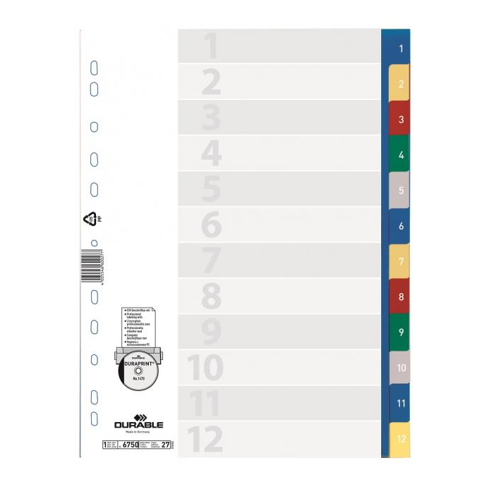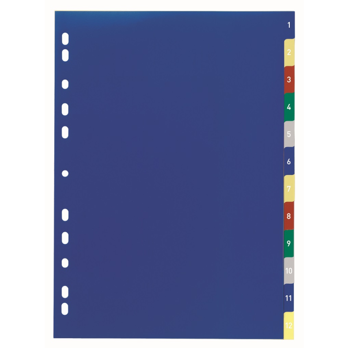 Farebný číselný rozraďovač vyrobený zo zosilneného plastu s eurodierovaním, popisovateľný papierový titulný list na ľahkú orientáciu v dokumentoch. Výsledný dokument pôsobí upravene a reprezentatívne. Väčšie balenie 20 sád.