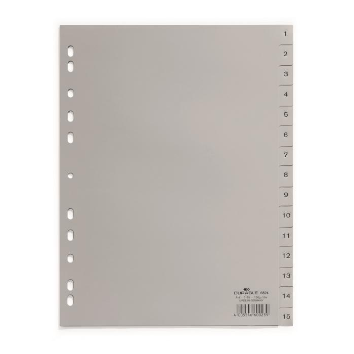 Číselný rozraďovač z polypropylénu. Formát A4, euro-dierovanie. Balenie jedna sada v polyesterovom sáčku. Väčšie balenie 20 sád. Farba sivá.