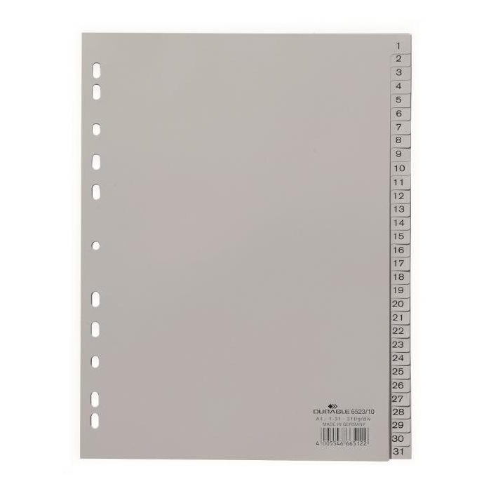 Číselný rozraďovač z polypropylénu. Formát A4, euro-dierovanie. Balenie jedna sada v polyesterovom sáčku. Väčšie balenie 10 sád. Farba sivá.