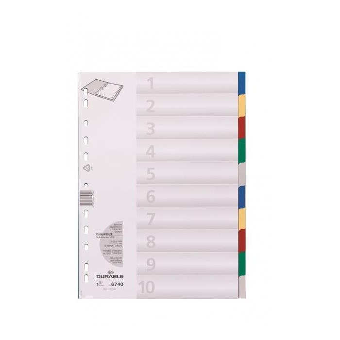 Farebný rozraďovač z polypropylénu s 10 oddielmi bez popisu. Formát A4, eurodierovanie, popisovateľný papierový titulný list na ľahkú orientáciu v dokumentoch. Balenie jedna sada v polyesterovom sáčku. Väčšie balenie 25 sád.