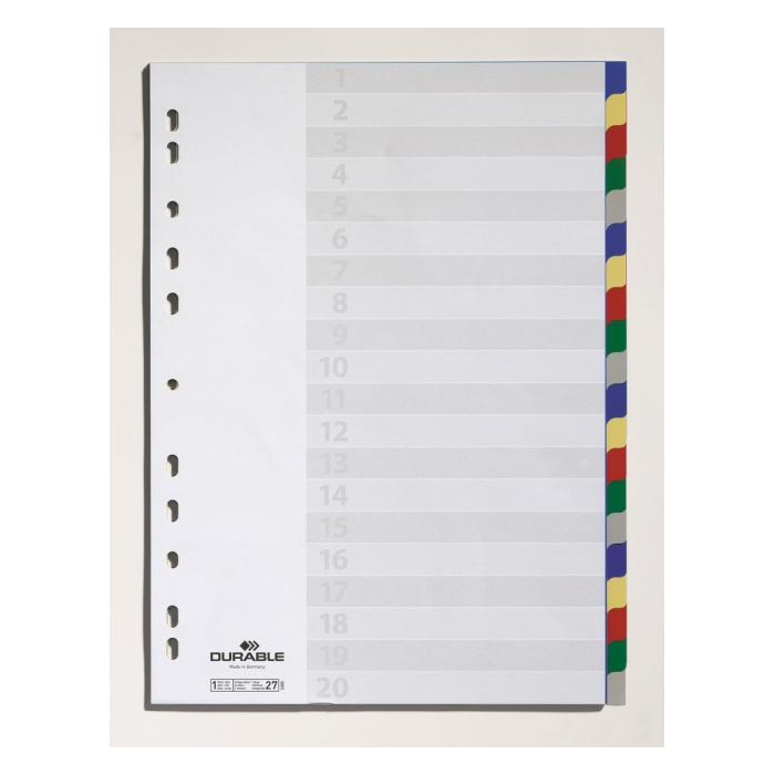 Farebný rozraďovač z polypropylénu s 20 oddielmi bez popisu. Formát A4, eurodierovanie, popisovateľný papierový titulný list na ľahkú orientáciu v dokumentoch. Balenie jedna sada v polyesterovom sáčku. Väčšie balenie 20 sád. Farba: 4x5 farieb Formát: A4