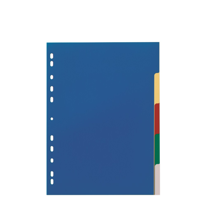 Farebný rozraďovač z polypropylénu s 5 oddielmi bez popisu. Formát A4, eurodierovanie, popisovateľný papierový titulný list na ľahkú orientáciu v dokumentoch. Balenie jedna sada v polyesterovom sáčku. Väčšie balenie 25 sád.