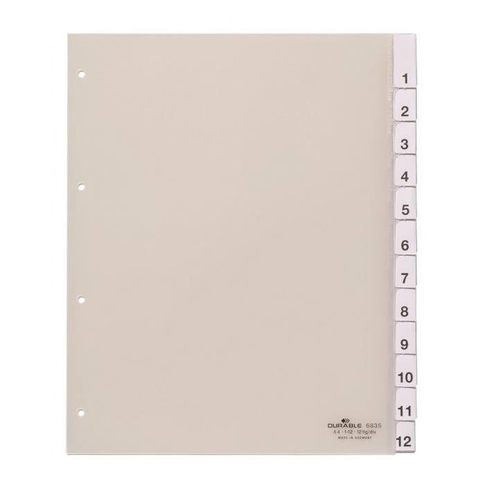 Polypropylénový rozraďovač s výmennými indexami vhodný na rozlíšenie zakladacích obalov. Formát A4 maxi, eurodierovanie, bez titulného listu. Súčasťou balenia sú náhradné výmenné indexy s mesiacmi JAN----DEZ. Balenie jedna sada v polyesterovom sáčku. Väčšie balenie 20 sád. Farba priehľadná. Farba: priehľadná Formát: A4 maxi Súčasťou: výmenné indexy JAN-DEZ