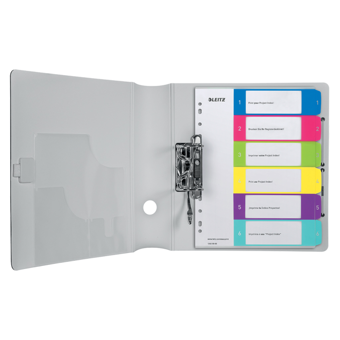 Opakovane použiteľný a extra odolný plastový číselný rozraďovač 1 - 6 v žiarivých farebných kombináciách s univerzálnou perforáciou. Materiál odolný polypropylén hrúbky 0,3 mm. Formát A4 maxi. Možnosť potlače na upravenie podľa vlastných potrieb, predloha stiahnuteľná zdarma na www.esselte.com/ easyprint.