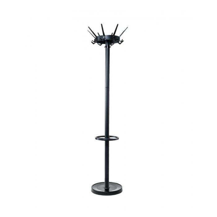 Vysokokvalitný oceľový vešiak je obzvlášť vhodný do prevádzok s vysokou premávkou, ako sú verejné priestory, úrady a pod. Robustný a elegantný oceľový stĺpik s matným čiernym práškovým náterom, ťažký betónový podklad potiahnutý plastom na zabezpečenie mimoriadnej stability. Matný povrch odolný proti poškriabaniu dáždnikom, 8 vešiakov na klobúky a 16 na kabáty z odolného ABS plastu, 4 prídavné plastové háčiky pod vešiakmi a 4 háčiky na stojane na dáždniky, stojan