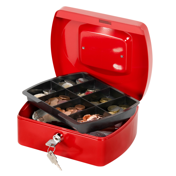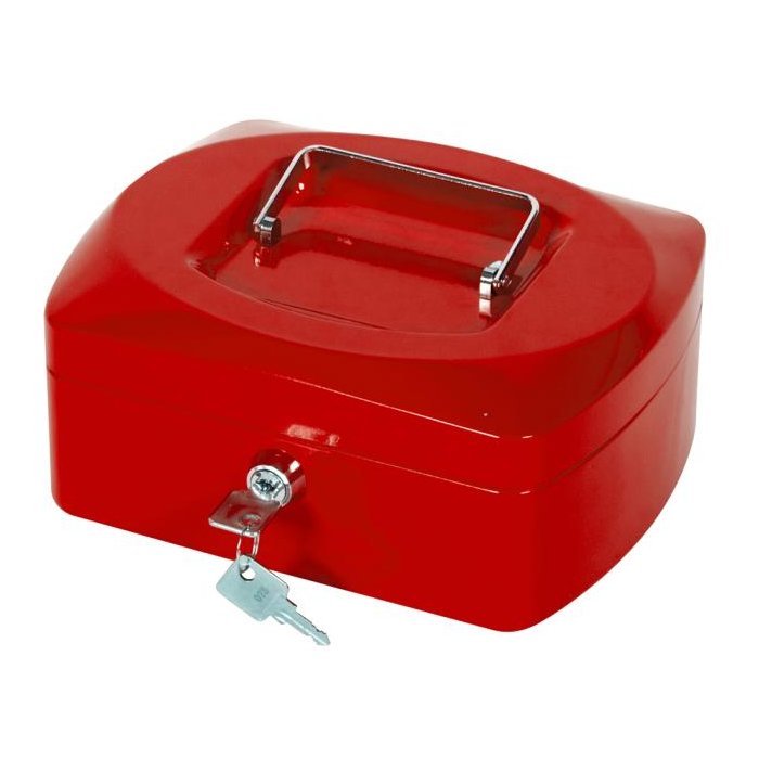 Uzamykateľná pokladnička s tvarovaným úchytom, plastovou priehradkou na mince a 2 kľúčami. Materiál pevná oceľ. Rozmery 205 × 85 × 160 mm. Farba červená.
