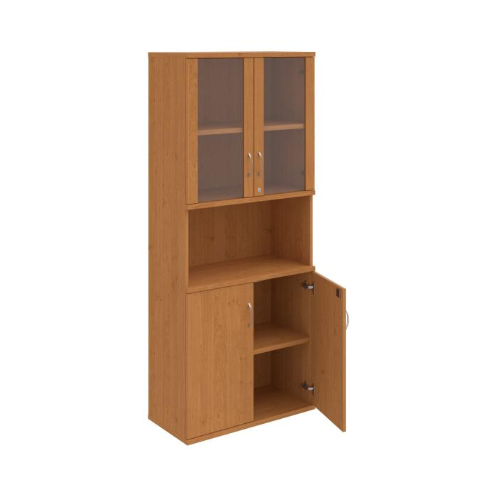 Kombinovaná skriňa - dvere/nika. Kancelárske skrine STRONG majú robustnú konštrukciu a vyššiu nosnosť políc ako bežné kancelárske skrine.V ponuke sú skriňové moduly s výškou 185 cm, 111 cm alebo 74 cm a šírky 80 cm alebo 40 cm. Hĺbka všetkých modelov skriňového radu STRONG je 40 cm.Chrbát, vyrobený z 8 mm hrubých dosák, je obojstranne pohľadový, takže skrine môžete použiť ako priestorový deliaci prvok. Hrúbka samotných políc je 25 mm, čo znamená nosnosť 80 kg na 1 policu.Korpusy, dvierka a police skríň sú olepené odolnou 2mm ABS hranou, ktorá garantuje dostatočnú ochranu proti poškodeniu.