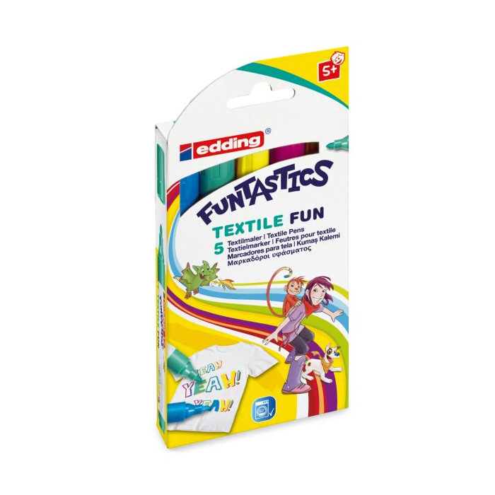 Detský popisovač na textil s okrúhlym hrotom. Plnený pigmentovým atramentom na báze vody s neutrálnym zápachom. Po zafixovaní farieb zažehlením (bez použitia pary) je možné farby prať až do teploty 60 °C. Dodávaný v sade 5 jasných farieb. Väčšie balenie 10 sád.