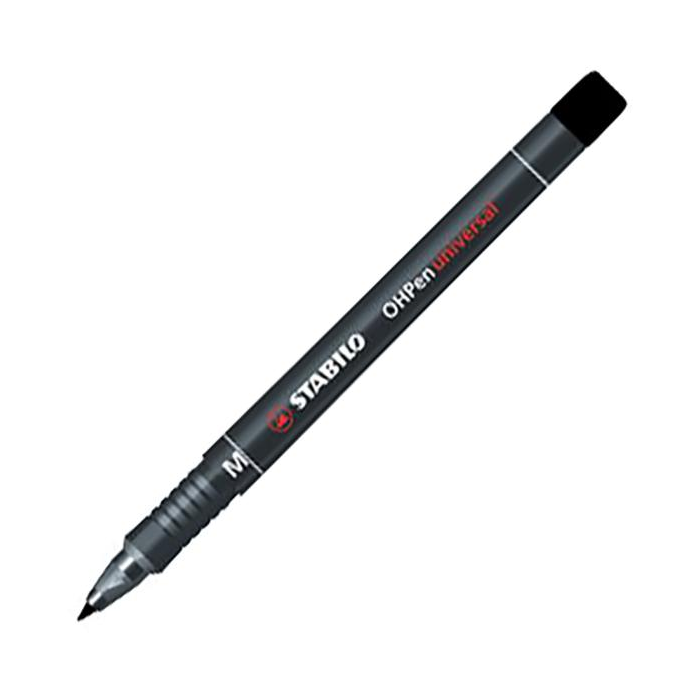 Permanentné popisovače na popisovanie takmer všetkých hladkých povrchov. Nekĺzavá úchytová zóna, praktický klip, bez vrchnáka vydrží až 3 dni. Väčšie balenie 10 ks v jednej farbe. STABILO® OHPen universal Medium (M). Hrot okrúhly, šírka stopy 1 mm. Farba čierna.