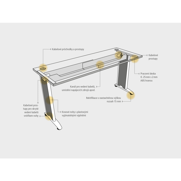 Kancelárský nábytok Flex sa vyznačuje elegantným dizajnom a originalitou technického riešenia. Pracovné dosky s optimálnými rozmermi a tvarom využívajú ergonomicky a efektívne celú pracovnú plochu. Pracovná doska stola má hrúbku 25 mm a je olepená 2mm ABS hranou, ktorá stoly pomáha chrániť pred poškodením. O káble od PC alebo stolovej lampy, sa postará praktická priechodka, ktorá káble jednoducho zvedie pod dosku, kde si s nimi poradia šikovne skonštruované držiaky. Moderné kovové nohy vás oslovia súčasným dizajnom a funkčnosťou. Prepojené sú teleskopickým káblovým kanálom, vďaka ktorému je stôl dokonale stabilný aj bez pracovnej dosky. Okrem toho slúži kanál aj ako elegantný úkryt pre vedenie všetkej kabeláže vášho PC, ktorá je potom pod plastovým krytom kovovej nohy zvedená k podlahe. Tento spôsob vychádza v ústrety aktuálnym trendom kompletne skrytej kabeláže.