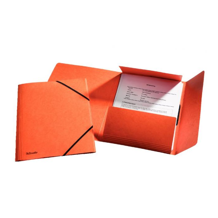 Obal A4 s tromi chlopňami a čiernou gumičkou. Materiál na dotyk príjemný prešpán. Prelisy na chlopniach a chrbte zvyšujú kapacitu obalu. Väčšie balenie 10 ks. Farba: oranžová
