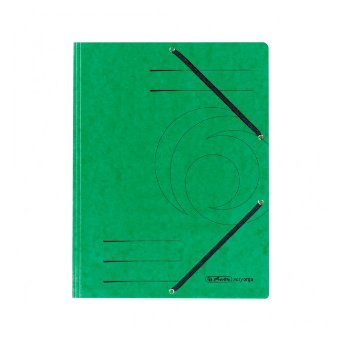Obal A4 s tromi chlopňami a dvomi gumičkami čiernej farby. Materiál prešpánový kartón gramáže 355 g / m². Väčšie balenie 25 ks. Farba zelená.