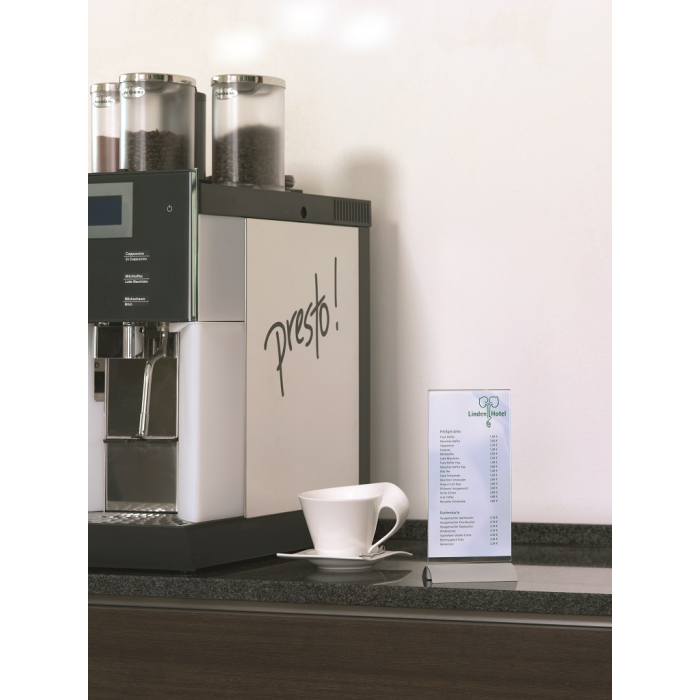 Stojan vhodný na prezentáciu ľubovoľných informácií s dobrou stabilitou. Vrchná časť vyrobená z kvalitného číreho akrylu, elegantný podstavec z hlíníka.