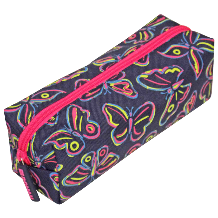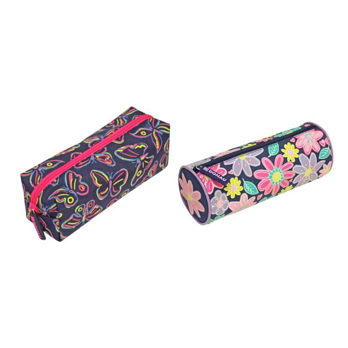 Puzdro na perá s jedným zipsom, dva rôzne tvary a farby, polyesterový materiál, farebná podšívka. Rozmery peračníka Motýle (D x Š x V): 22 x 8 x 7,5 cm / Rozmery peračníka Kvety: 21,5 x 8 x 8 cm