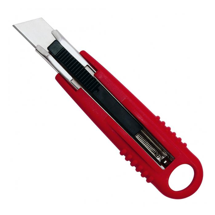 Rezač s pogumovanou časťou a pevnou kovovou hlavicou. Nôž sa vysúva pomocou bežca, ktorý treba počas rezania držať, čo zvyšuje bezpečnosť rezania. Integrovaný zásobník obsahuje 2 náhradné nože. Šírka čepele 18 mm. Schválené inštitútom TÜV. Farba čierna/ červená.